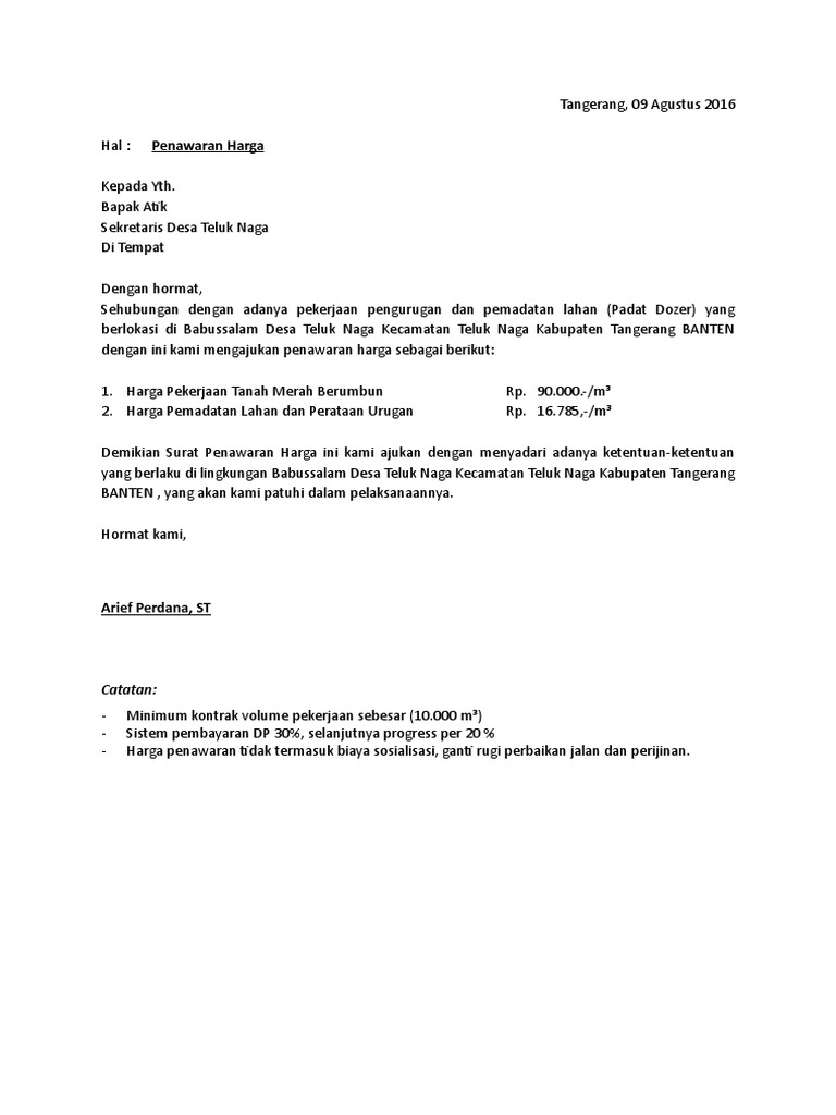 Dalam konteks surat penawaran harga tanah, maka informasi yang berkaitan dengan luas dan harga, harus kamu isi dengan jelas. Dalam surat ini, penjual atau perusahaan yang menjual sebuah produk menawarkan harga produk tertentu kepada pihak lain, biasanya toko, perusahaan, instansi, atau lembaga tertentu. Informasi penting tentang contoh surat penawaran harga tanah. Sehubungan dengan surat tersebut, kami bermaksud menawarkan salah satu tanah properti kami, yakni sebagai berikut posted in umumtagged contoh penawaran harga proyek, contoh surat pemesanan, contoh surat. Penjelasan lengkap seputar contoh surat penawaran yang baik dan benar. Dalam berbisnis, penggunaan surat niaga memang sangat. Pada umumnya, surat ini dipergunakan untuk menawarkan harga barang dan jasa, ataupun harta benda tertentu. Contoh berita acara negosiasi dan klarifikasi harga. Dalam dunia bisnis, penawaran akan selalu ada antara pihak satu dengan pihak lainnya. Surat ini bisa dibuat atas inisiatif perusahaan, atau sebagai balasan atau surat permintaan penawaran yang dibuat oleh calon pembeli. Apapun jenis dan bentuknya, tanah jarang mengalami penurunan nilai, kecuali ada penyebab eksternal yang mempengaruhi. Contoh surat penawaran dalam bisnis. Kepentingan surat penawaran seperti ini dalam dunia bisnis adalah jalan pembuka untuk negosiasi harga.